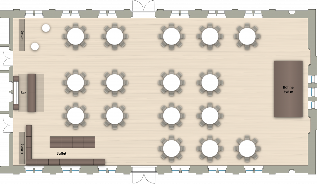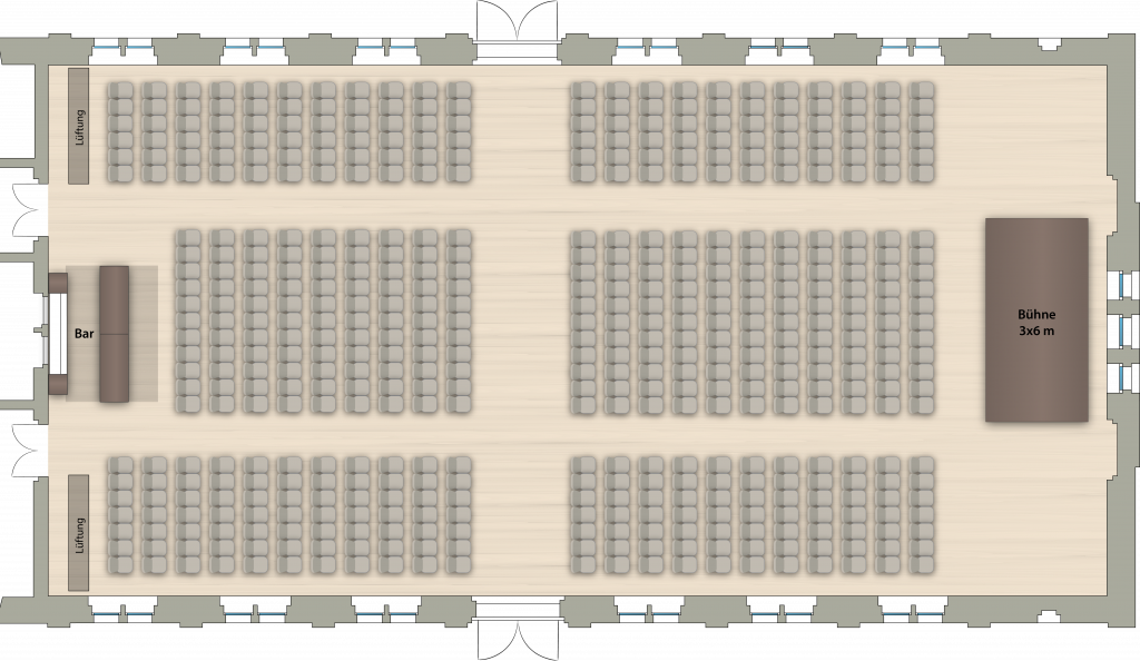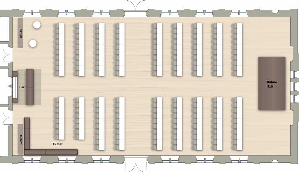 Die hier gezeigten drei Varianten sind nur Beispiele – der Saal bietet zahlreiche flexible Gestaltungsmöglichkeiten. Die maximale Personenzahl hängt von Aufbau, Ausstattung und gewünschtem Ablauf ab und kann je nach Event über die dargestellten Varianten hinaus erweitert werden.